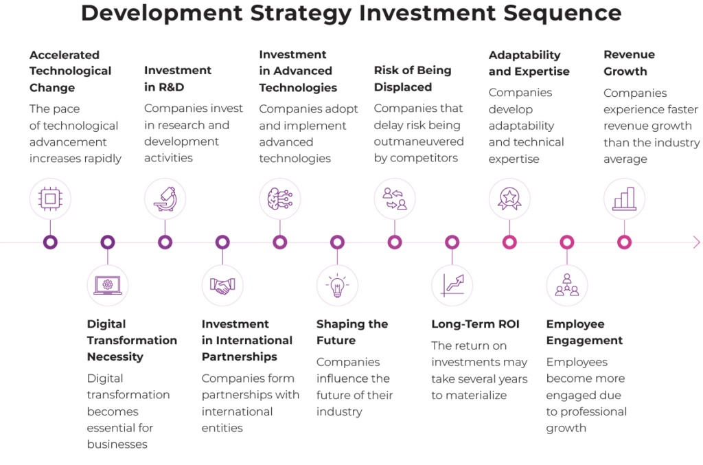 The return on investment in a development strategy is not always immediate. Research may take years before it becomes commercially viable. International partnerships require time to build trust and learn shared processes. Implementing new technologies is an ongoing process that demands organizational changes, team training, and iterative improvement.