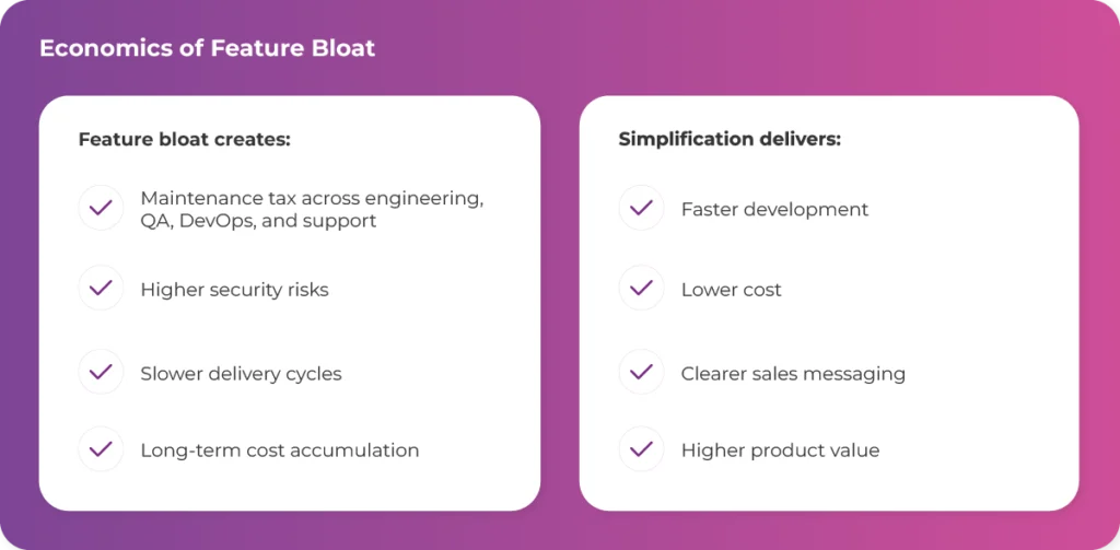Every feature adds a permanent cost: documentation, testing, security review, bug fixing, technical debt management. Over time, even small additions compound into slower delivery cycles and higher operational costs.