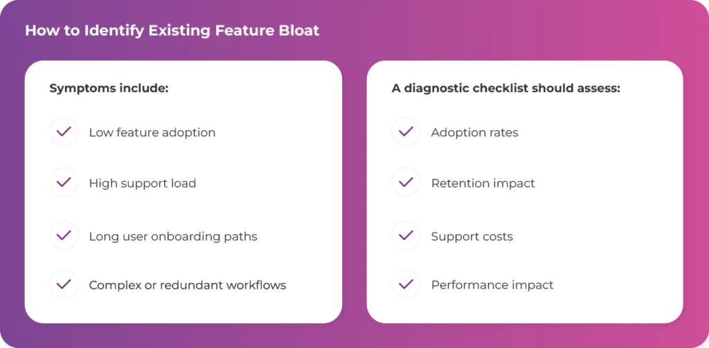 Real-world indicators of feature bloat include: