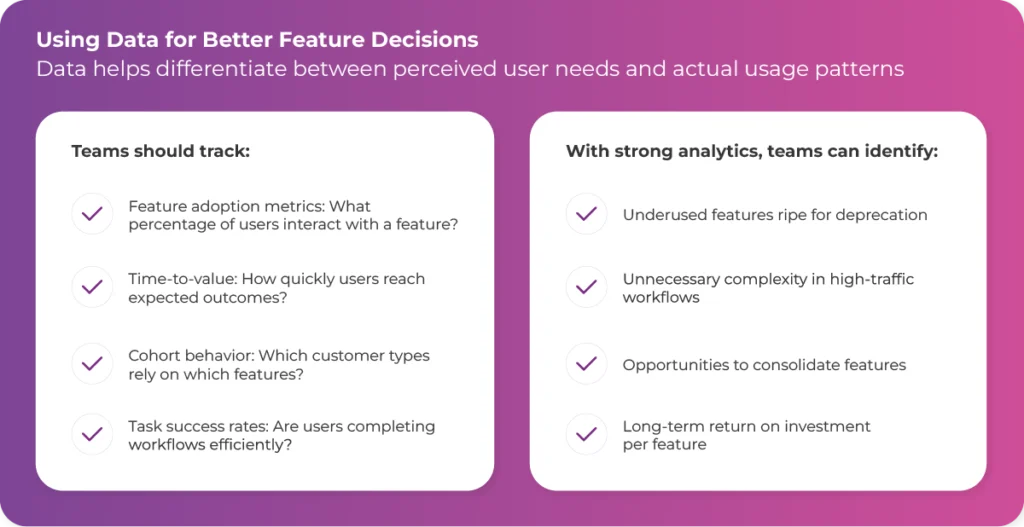 When complexity compounds, innovation slows. Teams spend more time modifying existing features than creating new values. At this stage, feature bloat can be a silent killer for product momentum.