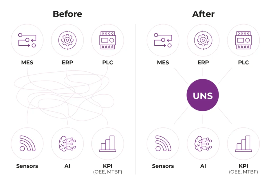 Le Unified Namespace (UNS) apporte une réponse structurante à ce problème. Il consiste à rassembler les données issues des machines, des systèmes et des applications dans une couche unique, organisée et contextualisée, avec une structure commune compréhensible par l’ensemble de l’écosystème industriel.