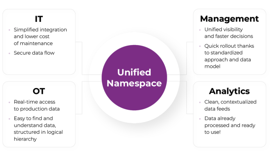 L’usine devient ainsi le point central des flux de données, des opérations et des initiatives de transformation digitale. Sur le plan technique, le Unified Namespace permet de diffuser les données en continu depuis les équipements, les systèmes OT et les applications IT vers une couche unique qui standardise les formats, ajoute du contexte et supprime les intégrations point à point rigides. Il agit comme un socle d’interopérabilité temps réel entre IT et OT.